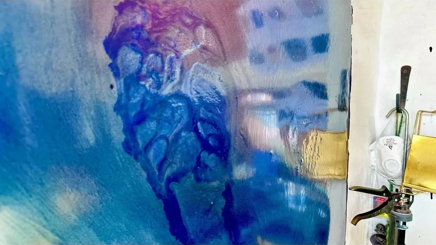 mixed media painting covered by resin and pigment on wood
